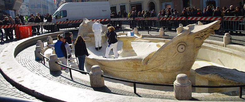 Sono al lavoro dalle prime luci di questa mattina i restauratori della Sovrintendenza capitolina, per verificare e accertare i danni riportati alla Barcaccia del Bernini al centro di piazza di Spagna, mira, nel pomeriggio di ieri, della furia olandese (qui foto e dettagli). Anche gli operatori dell'AMA stanno lavorando per rimuovere le ultime tracce degli scontri di ieri, mentre i tecnici del Servizio Giardini stanno verificando eventuali danni ad aiuole e alberature.