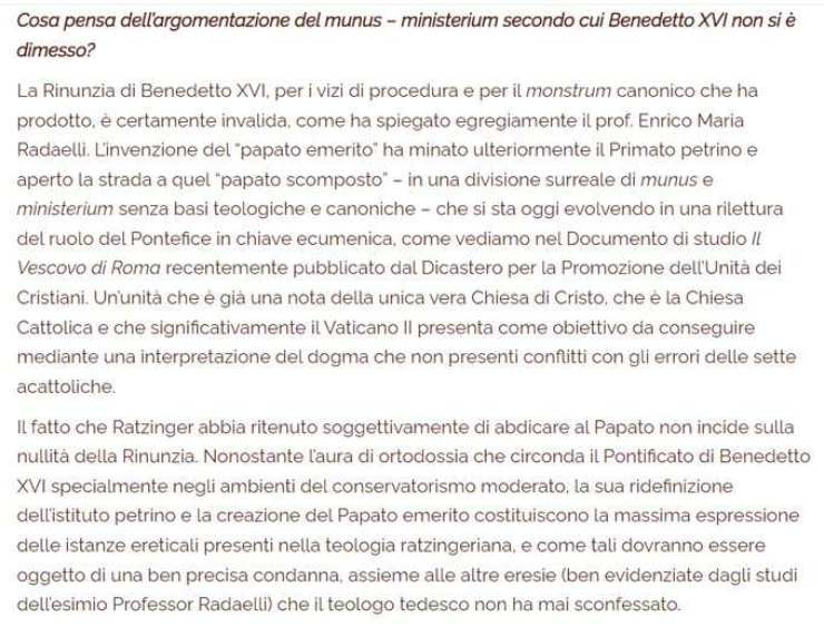 Per anni ha parlato malissimo di Bergoglio (a buona ragione) ma continuando a considerarlo legittimo papa. Poi, finalmente, nel luglio 2024, in un’intervista al vaticanista Taylor Marshall ha testualmente dichiarato che la rinuncia di Benedetto XVI “è certamente invalida”, ma questo perché Ratzinger era eretico e modernista.