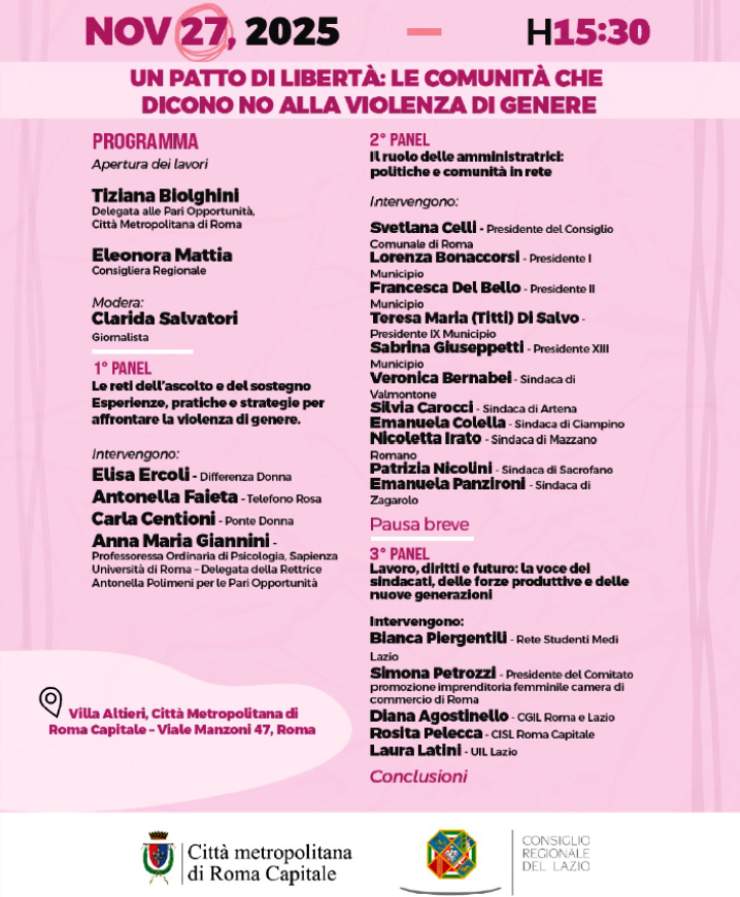 La Giornata Internazionale per l’eliminazione della violenza contro le donne resta un appuntamento che impone responsabilità e visione. Giovedì 27 novembre, alle 15:30, Villa Altieri ospiterà il convegno “Un patto di libertà: le realtà che dicono no alla violenza di genere”, promosso da Eleonora Mattia, consigliera regionale del Lazio, e da Tiziana Biolghini, Delegata alle Pari Opportunità della Città metropolitana di Roma Capitale. Un’occasione pensata per riunire associazioni, rappresentanze istituzionali, sindacati, forze produttive e università con l’obiettivo di rafforzare reti, condividere metodologie e raffinare strumenti necessari al contrasto della violenza e alla diffusione di una cultura autentica della parità.